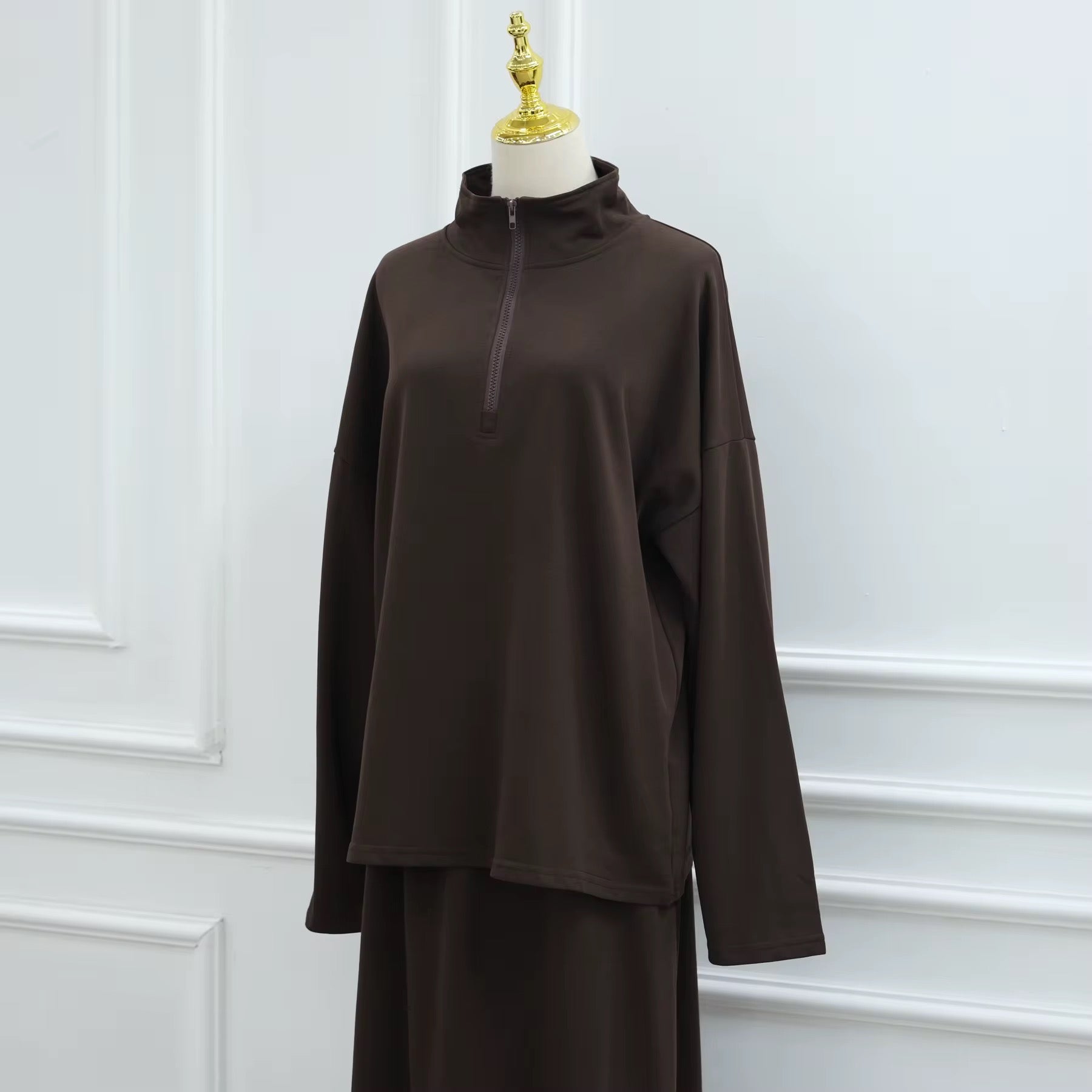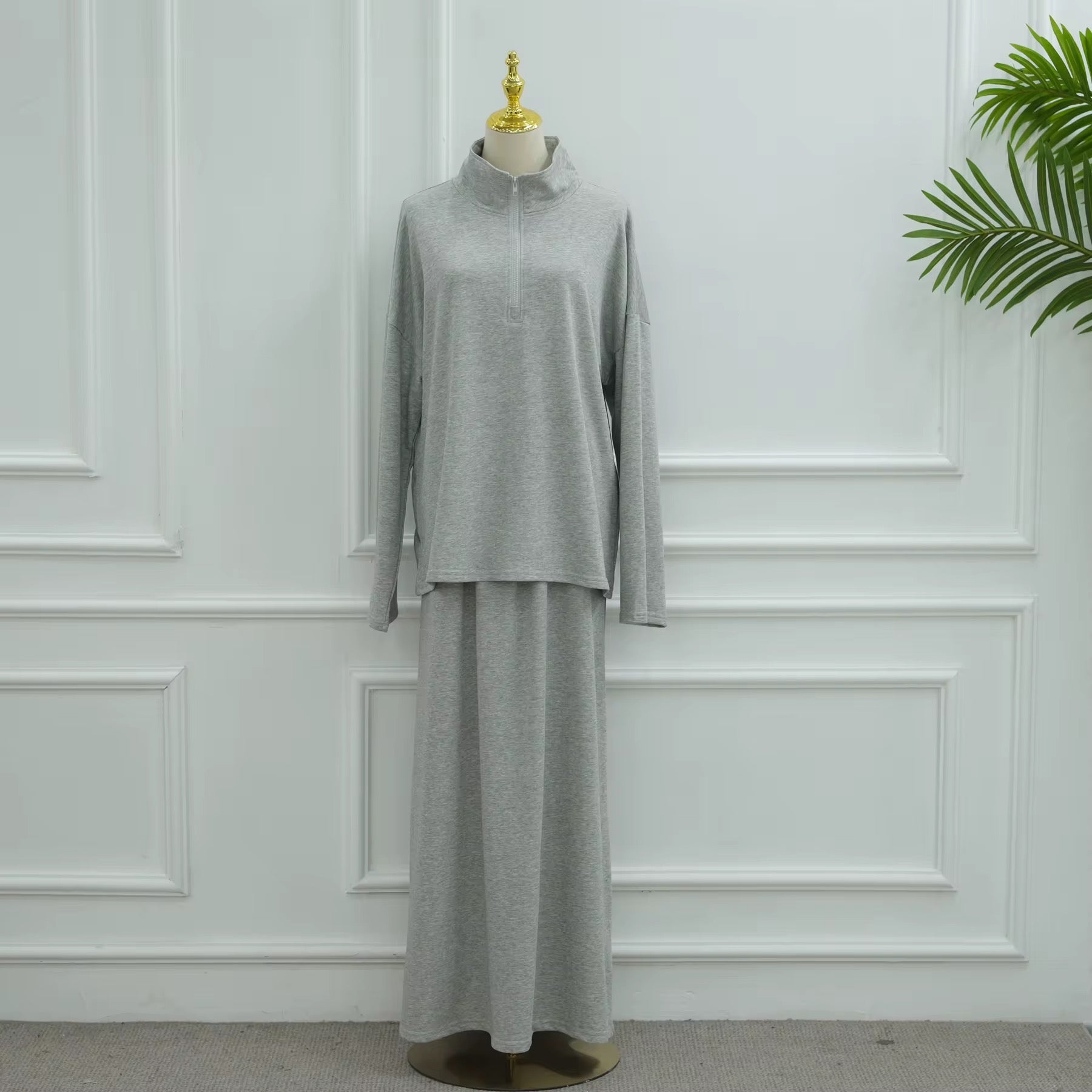 Step into effortless sophistication with this Modest Activewear Set, designed for the woman who values both movement and modesty. Thoughtfully crafted, the long-sleeve quarter-zip top and flowing skirt offer a refined silhouette that feels elevated yet understated.
