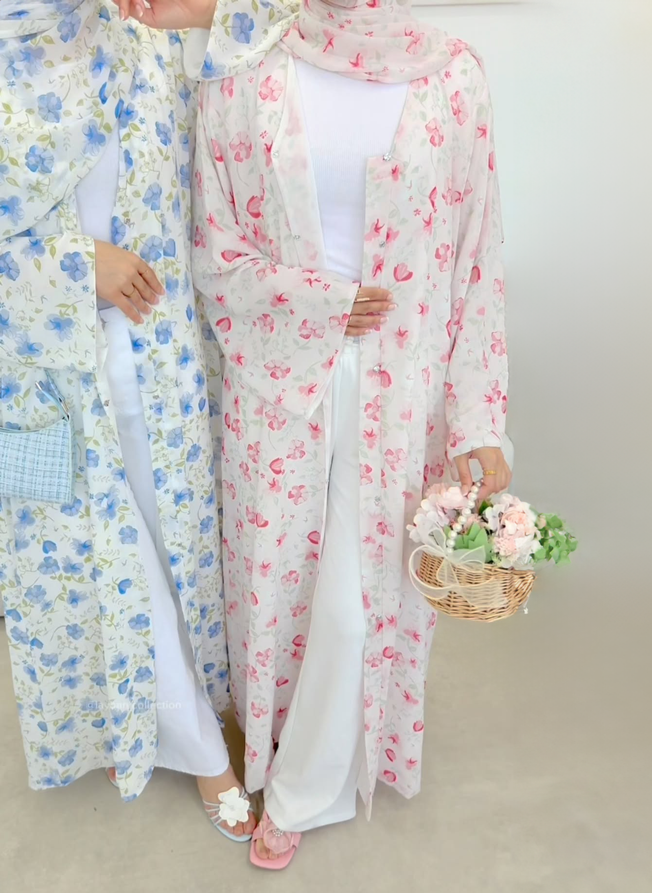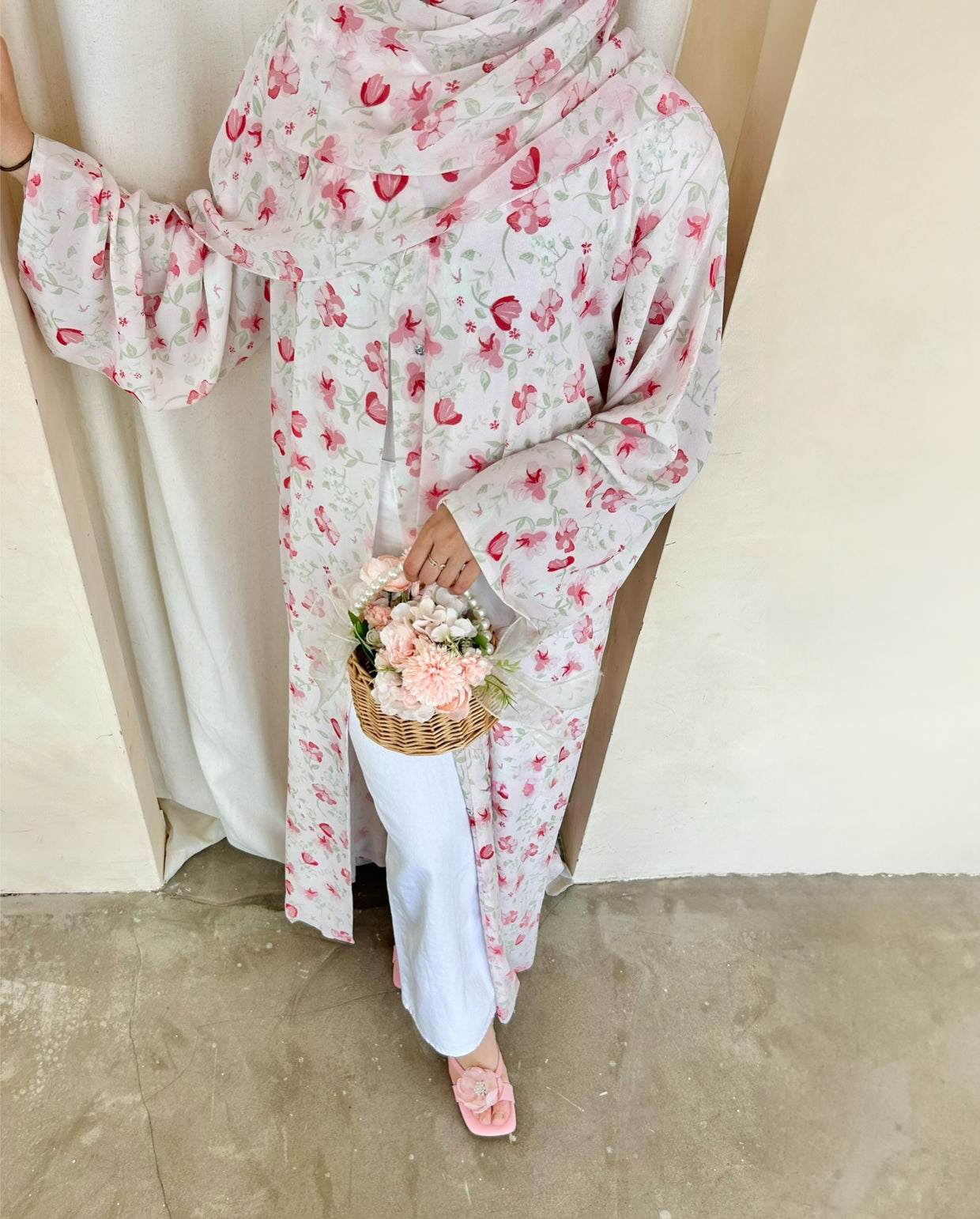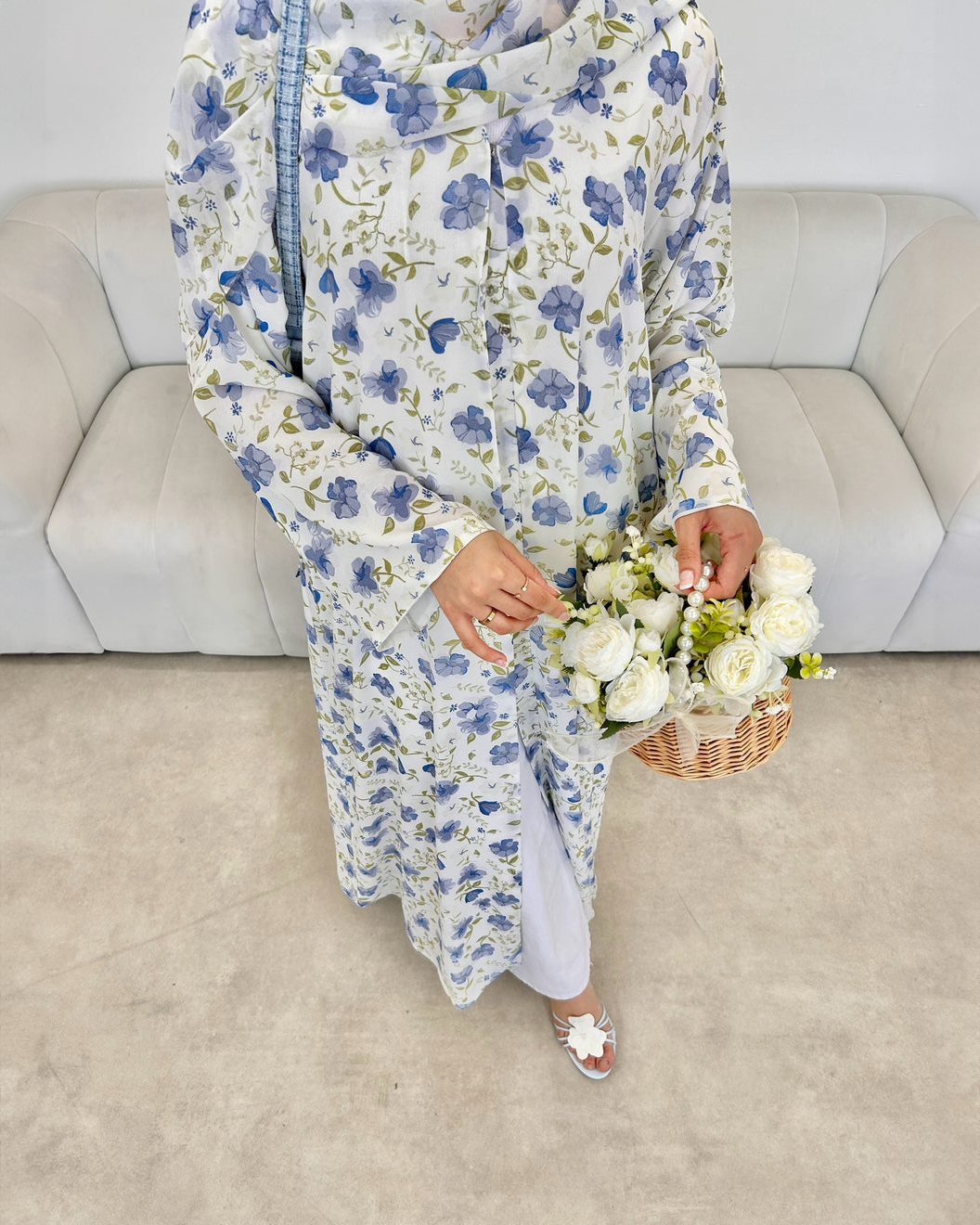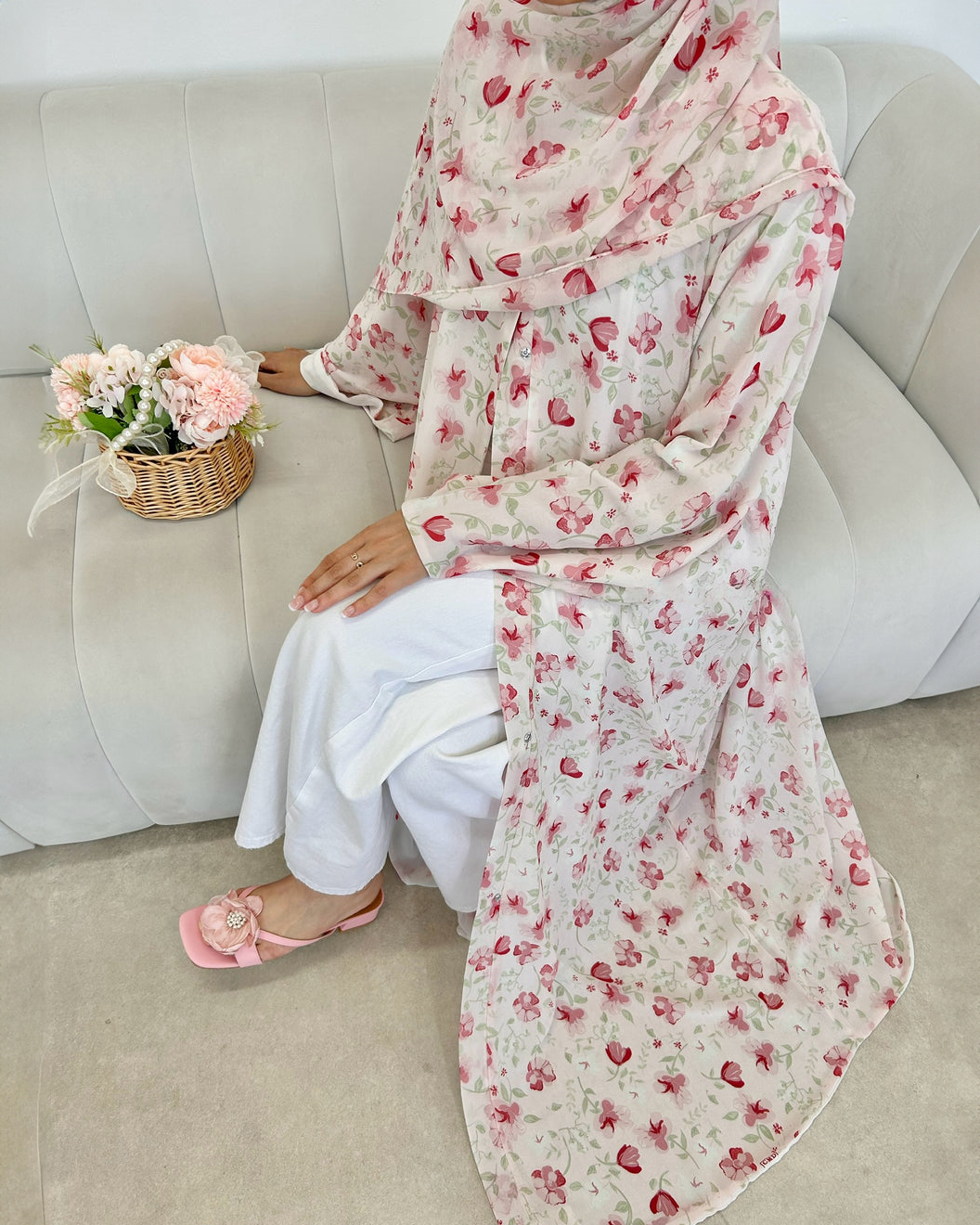 Rawdah – a floral abaya inspired by serene gardens and sunlit picnics. This modest summer abaya features a breezy, flowy silhouette with a picnic-style print and soft florals, perfect for warm days, Eid gatherings, or casual outings. Lightweight, feminine, and full of grace – Rawdah is the ultimate garden abaya for the woman who loves beauty and modesty in every season.