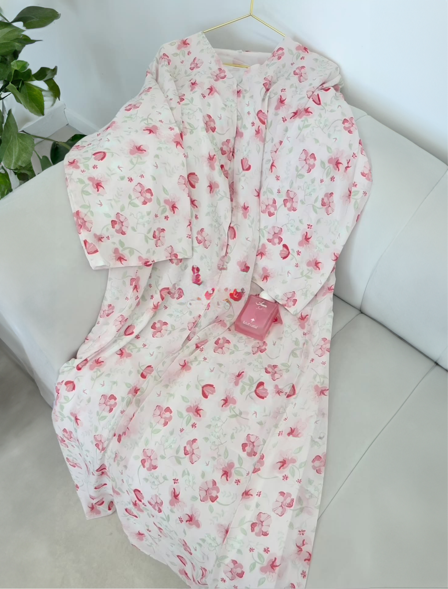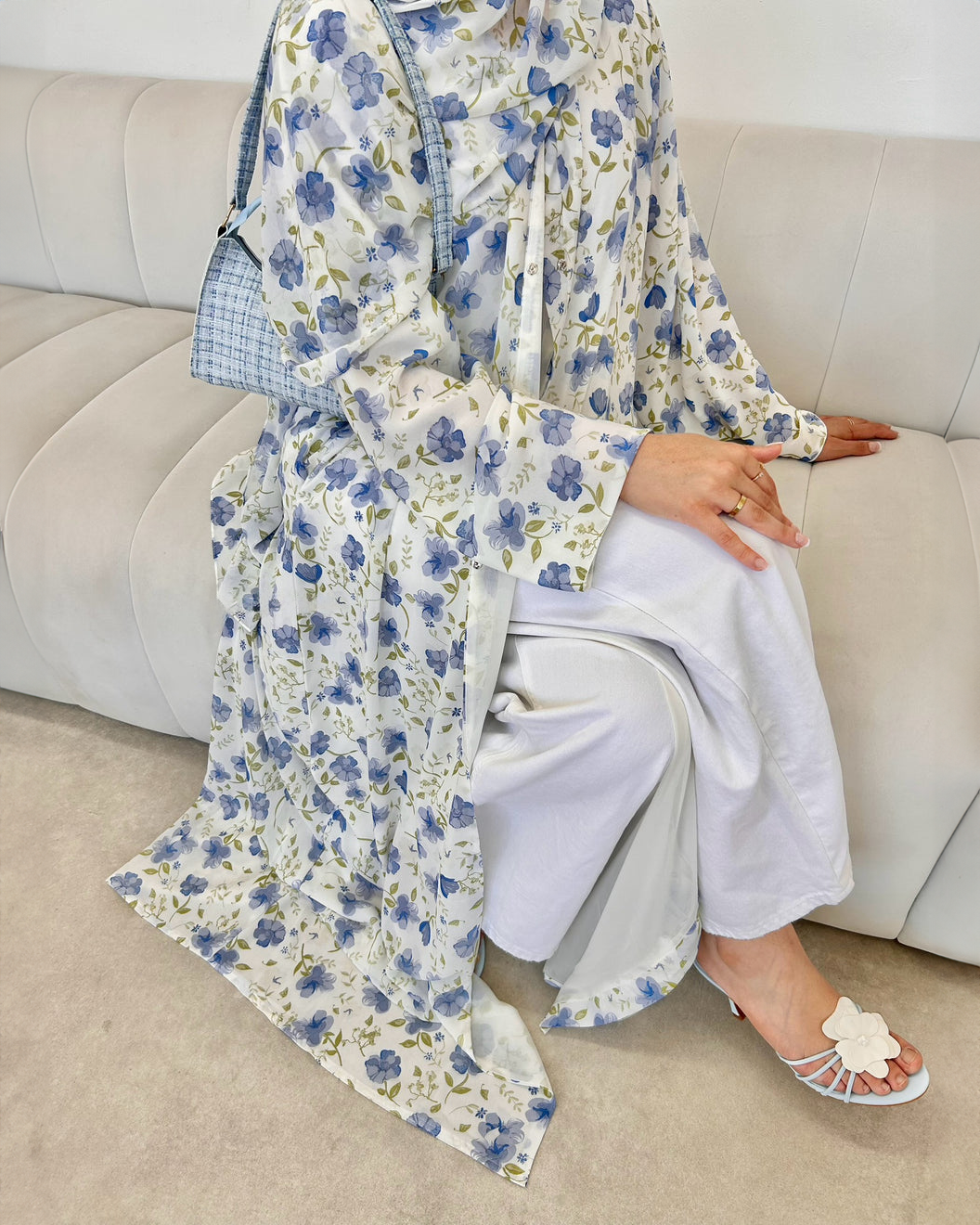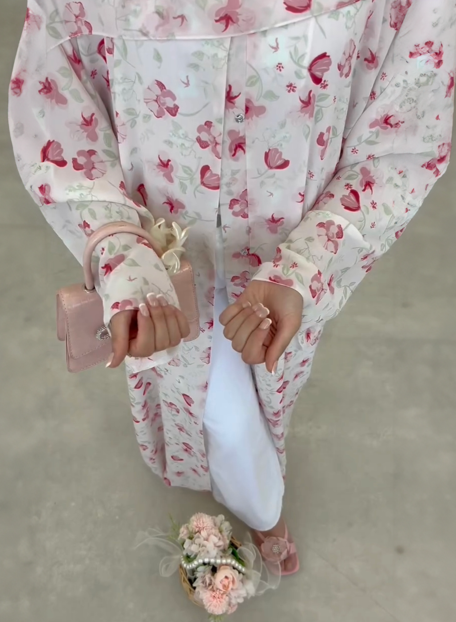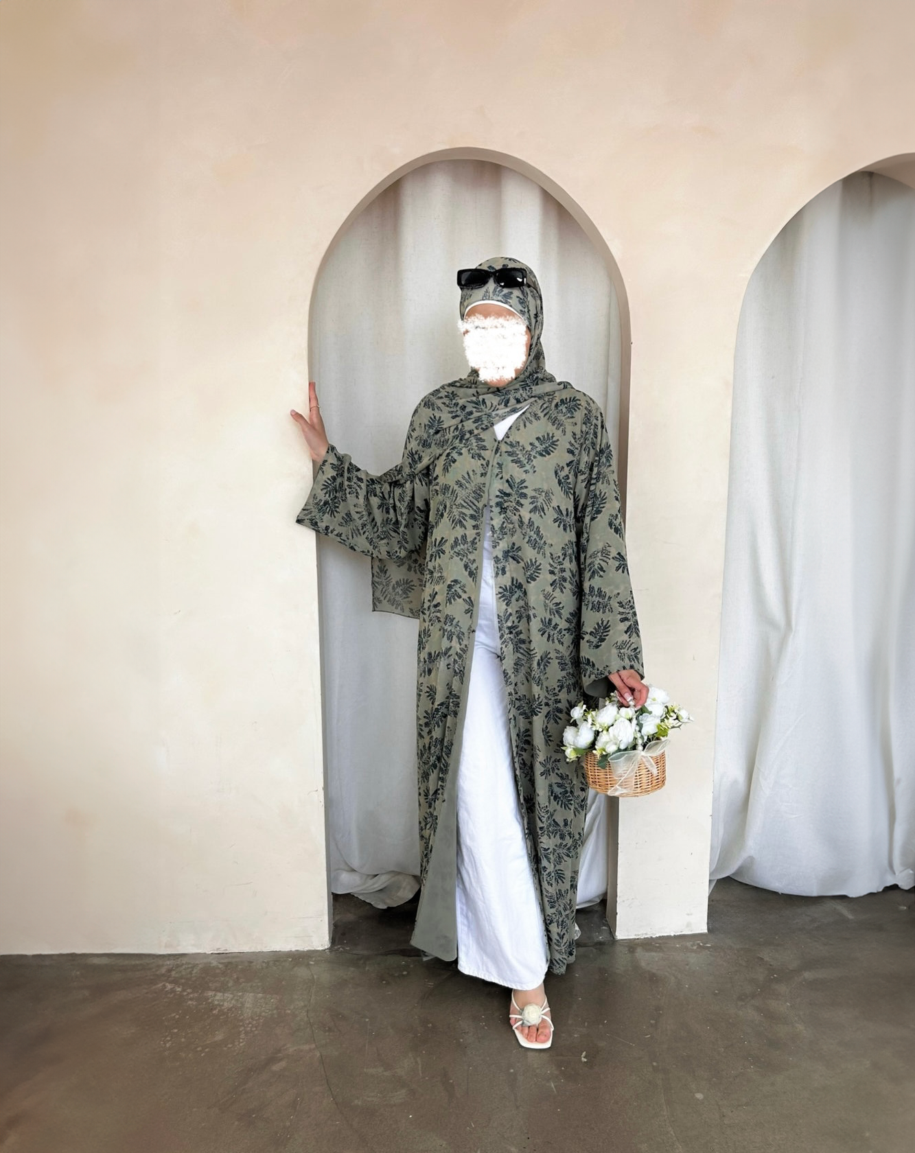 Rawdah – a floral abaya inspired by serene gardens and sunlit picnics. This modest summer abaya features a breezy, flowy silhouette with a picnic-style print and soft florals, perfect for warm days, Eid gatherings, or casual outings. Lightweight, feminine, and full of grace – Rawdah is the ultimate garden abaya for the woman who loves beauty and modesty in every season.