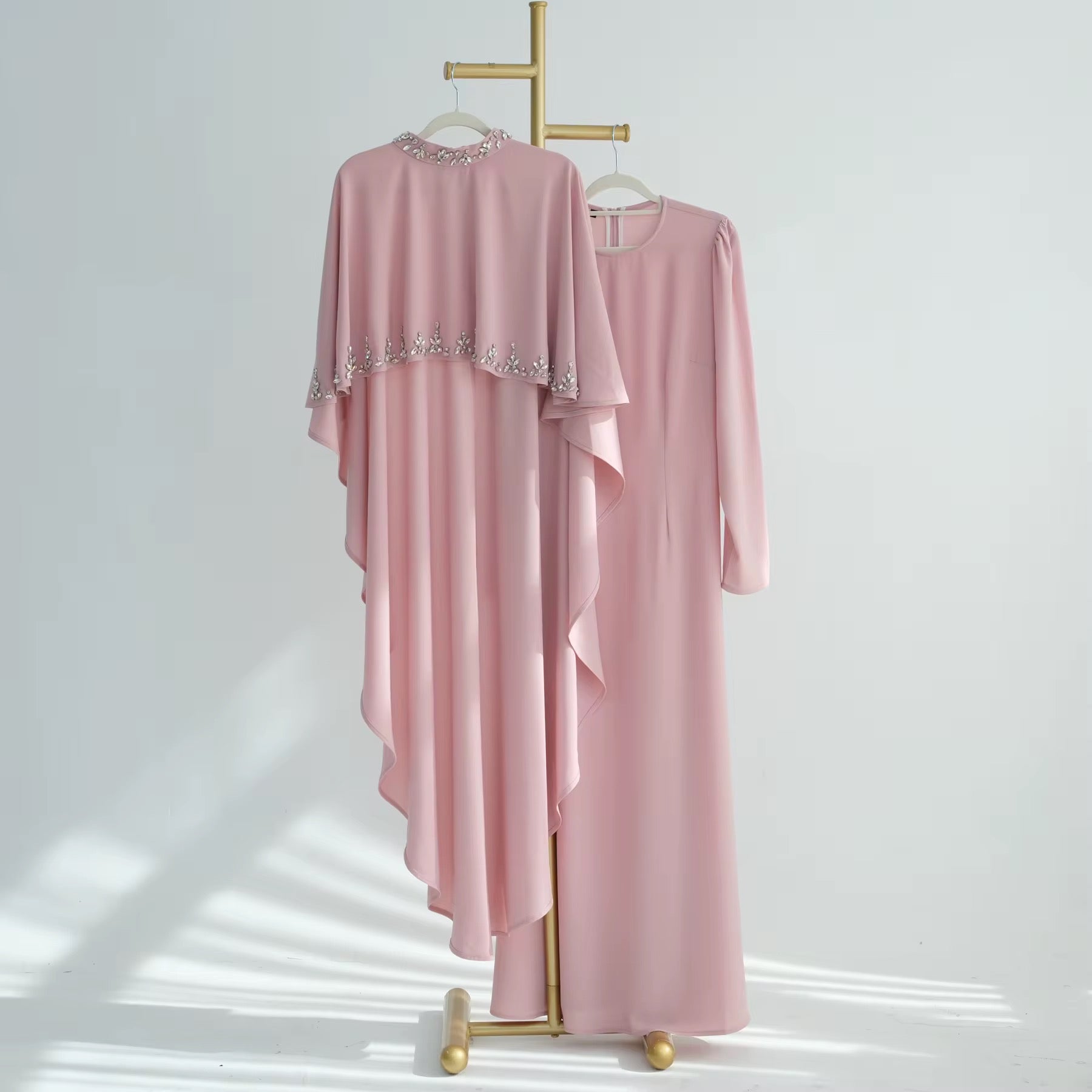 Step into timeless elegance with the Starry Night Cape Dress Set. Featuring a graceful cape silhouette and delicate gem embellishments, this elegant dress blends modern refinement with modest charm. The cape fabric flows effortlessly, and the added cinch creates a flattering silhoutte while adding a regal touch to any look. Ideal for special occasions or elevated everyday wear, the Starry Night Cape Abaya makes a statement without saying a word. Dress it up with heels or style it simply—its versatility is matched only by its sophistication.